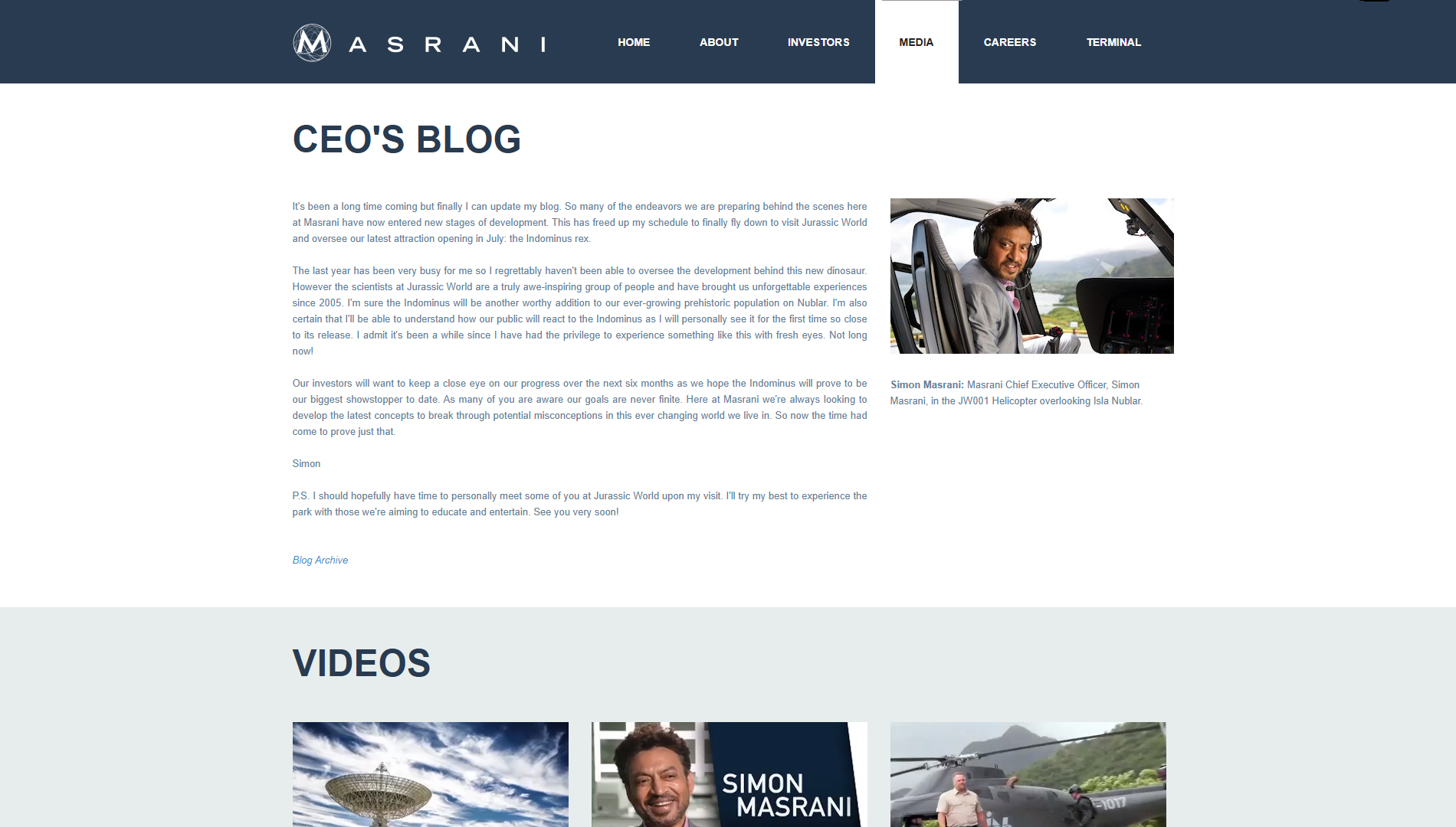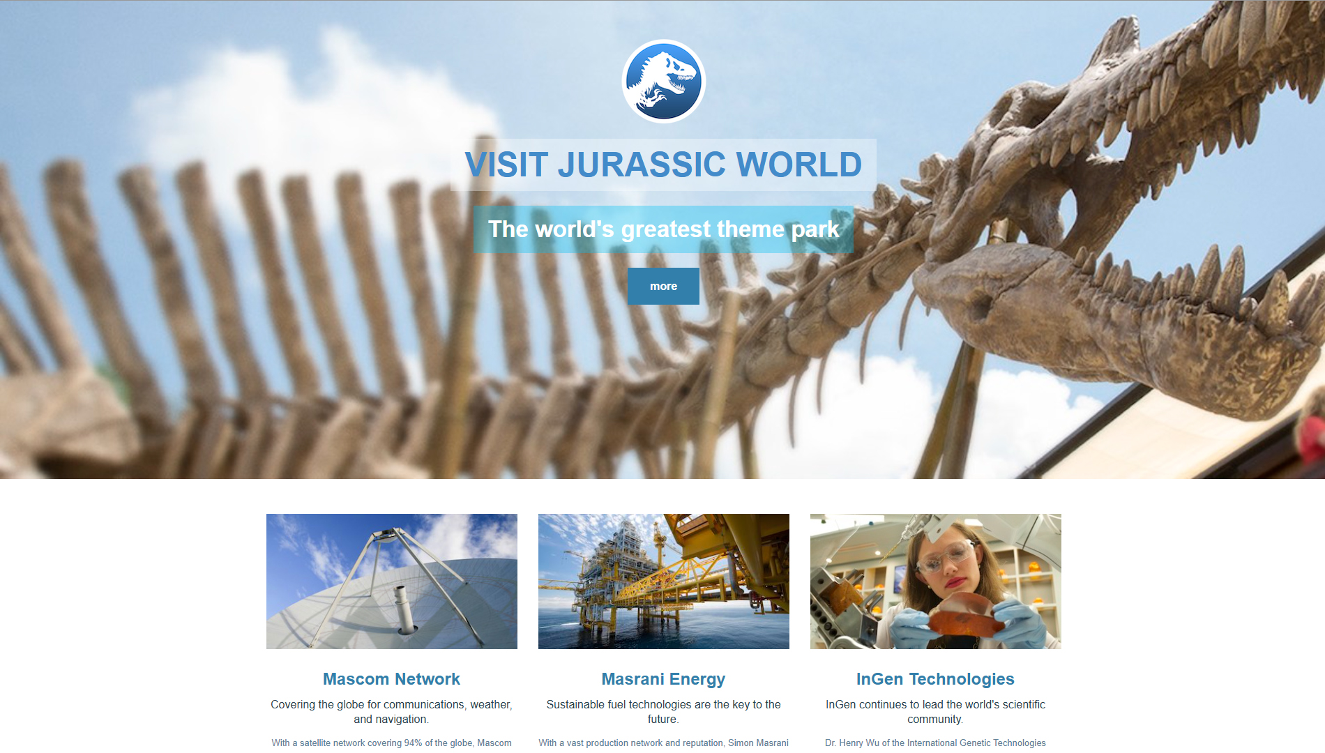 Quite a lot! We had several meetings with Colin and Universal, both in person and through Skype at the time, and many between myself and Tim on what the Masrani website should deliver in terms of feeling like a real website. We had done a lot of leg work with the early Patel-Corp site which initially got us the job, but there were a lot of the nuances needed to embody the character of Masrani through the site.