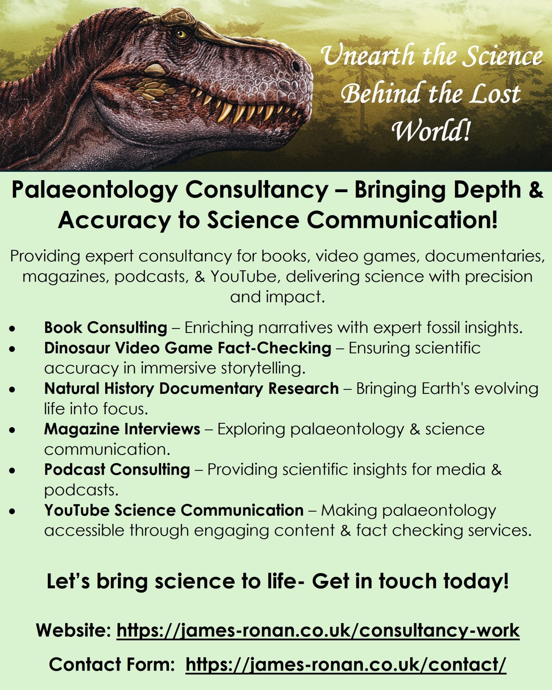 Looking for scientifically accurate dinosaur content? I provide fact-checking, research support for books, video games, documentaries, interviews, and science communication projects. Let’s collaborate to bring natural history to life!